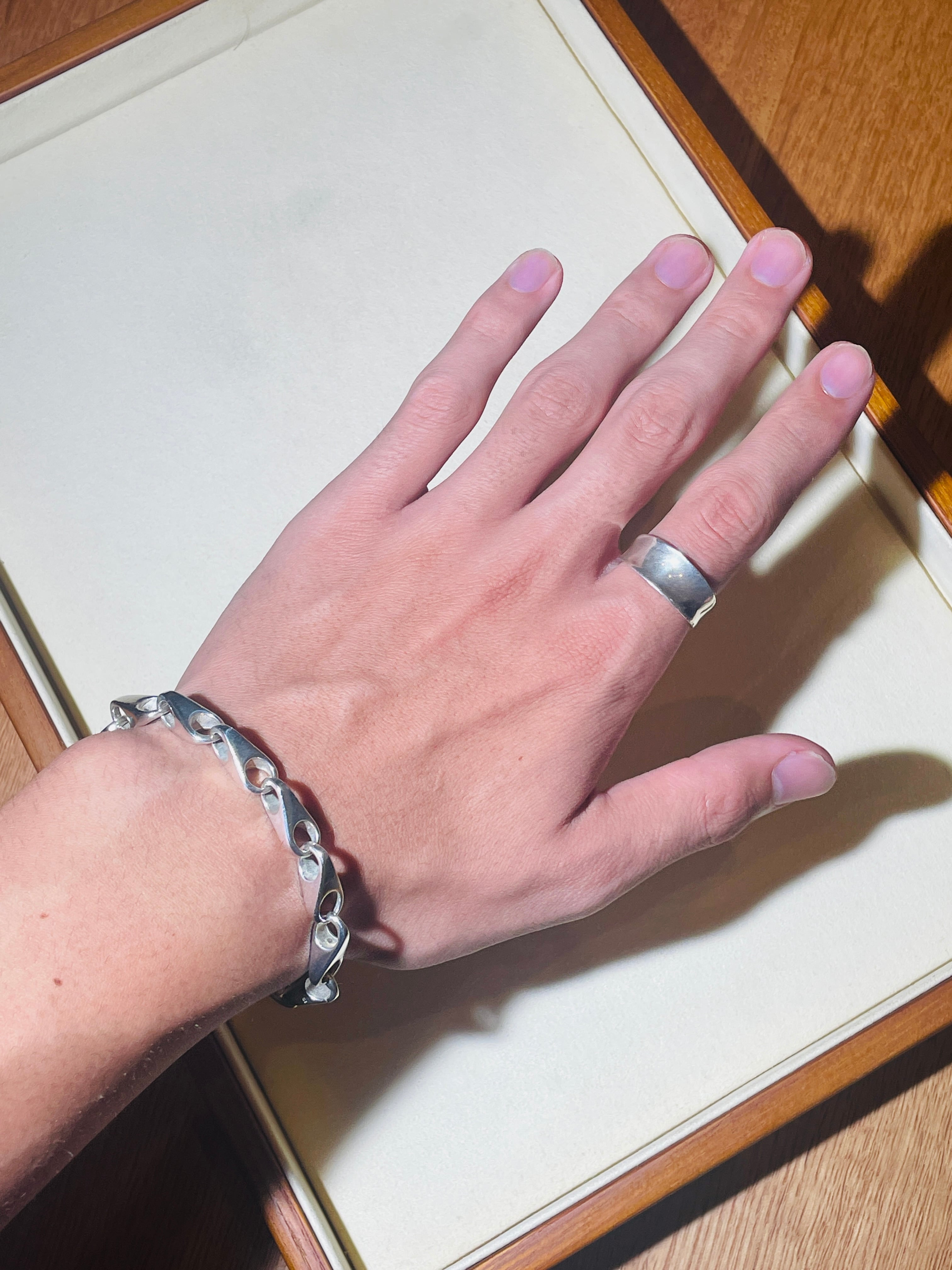ティアドロップデザインのシンメトリーなコマを繋げたチェーン。職人の手作業で作られるコマは独創的な美しい形で、肌馴染みも良いです。