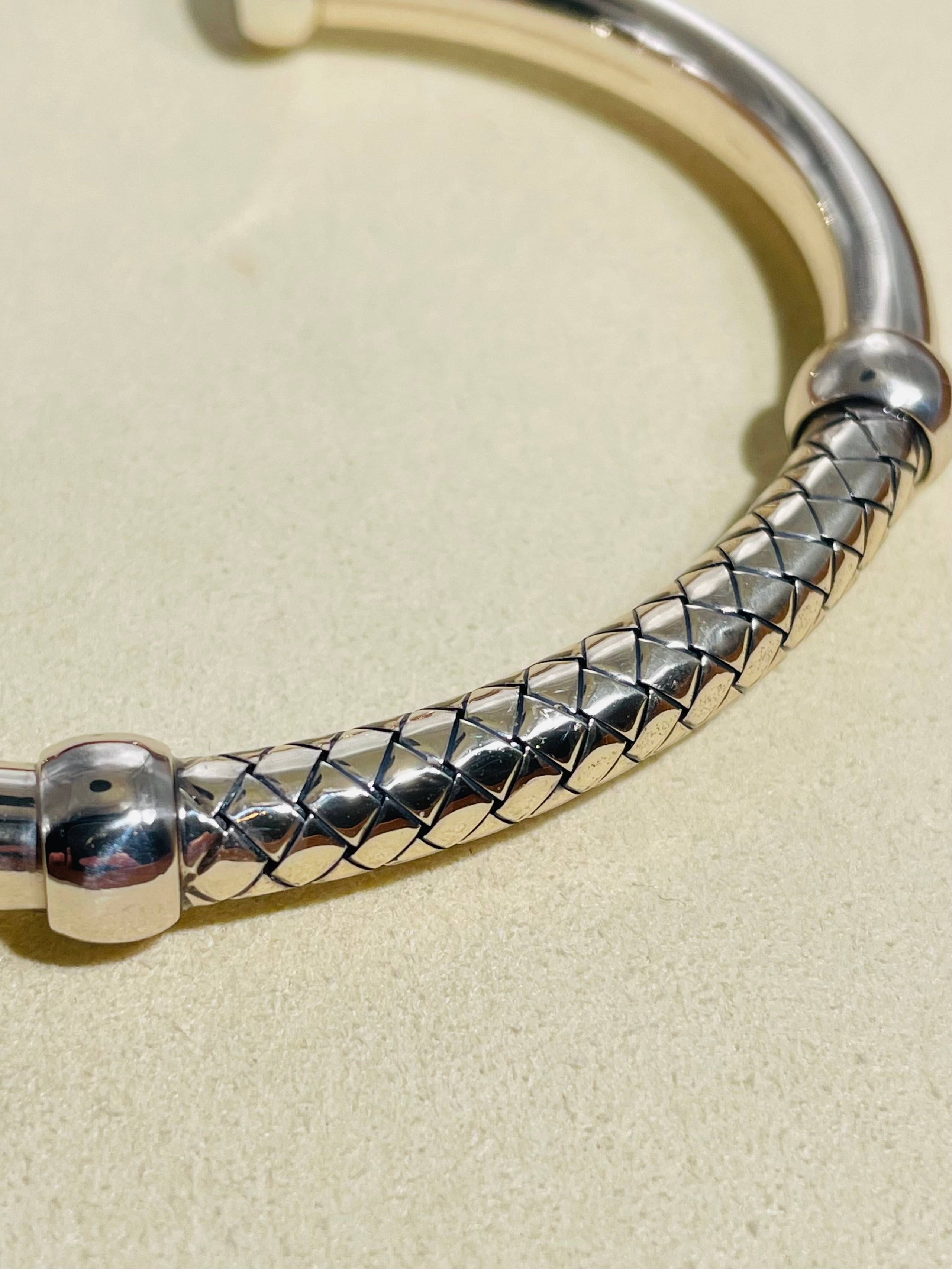 象徴的なイントレチャートデザインをシルバーで再現した作品で、職人技の丁寧な織り込みは繊細で独自の存在感があります。