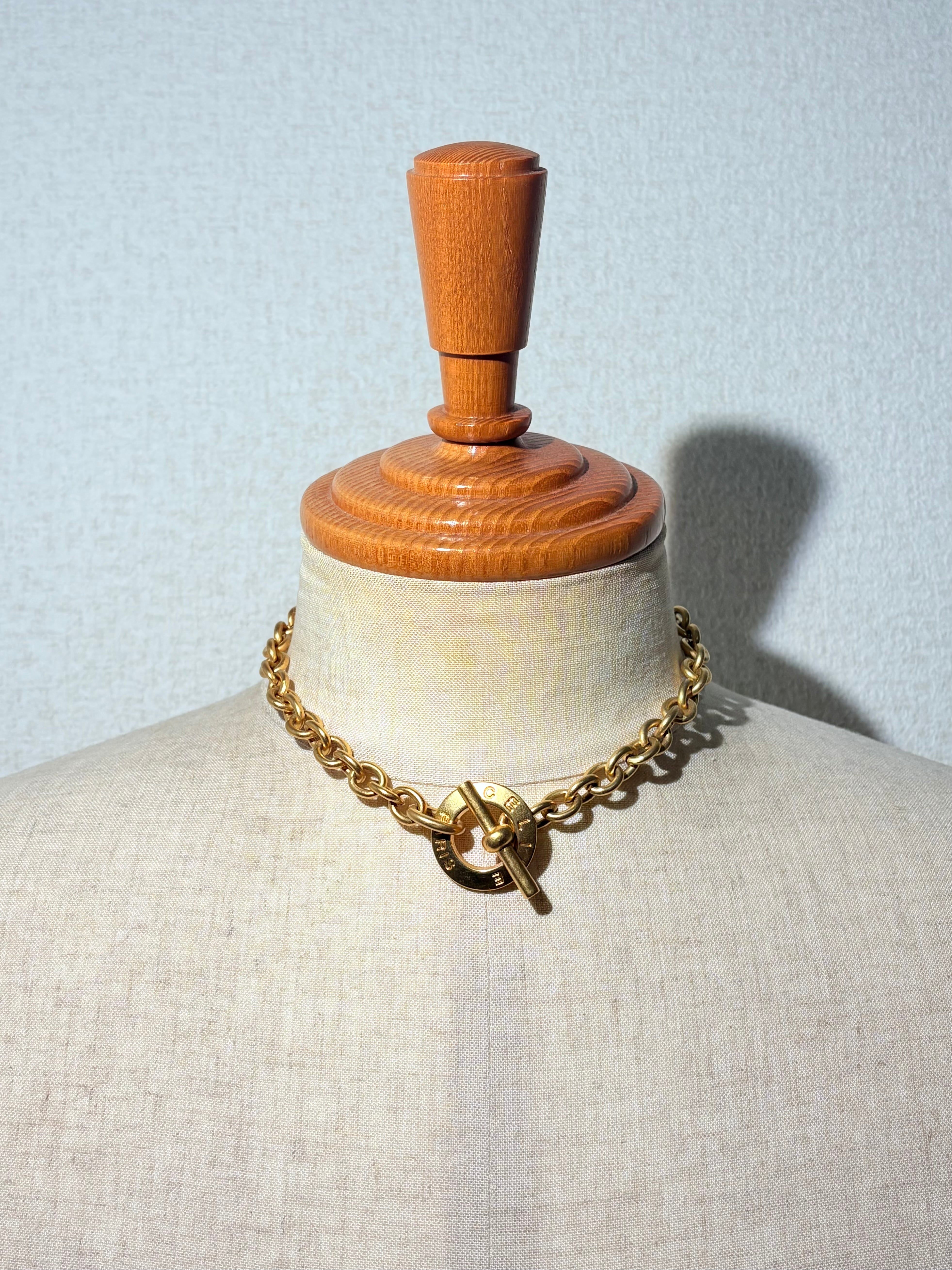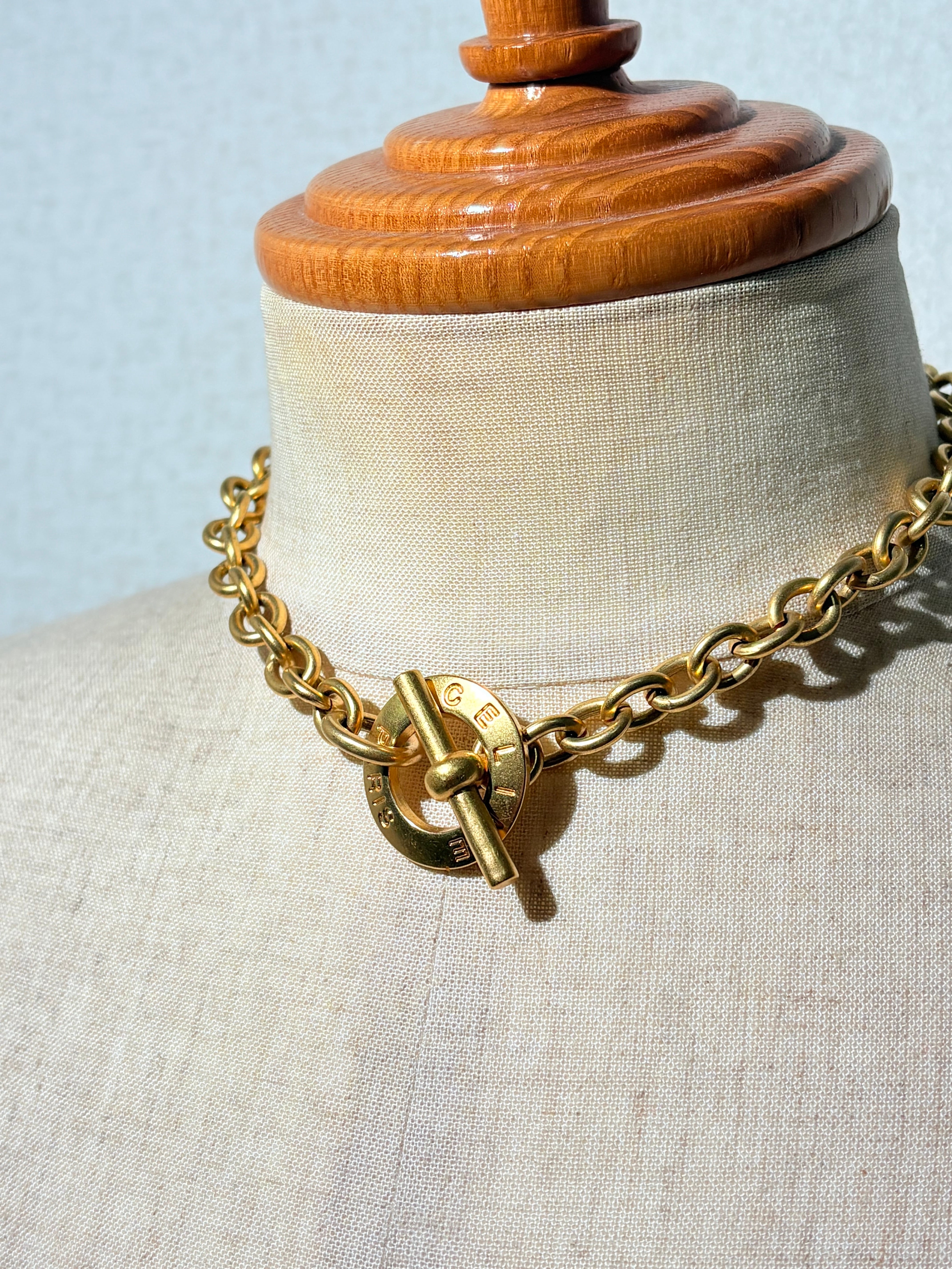 80年代後半特有の巨大な留め具が象徴的なネックレス。シンプルなオーバルチェーンに存在感のあるトグル。
