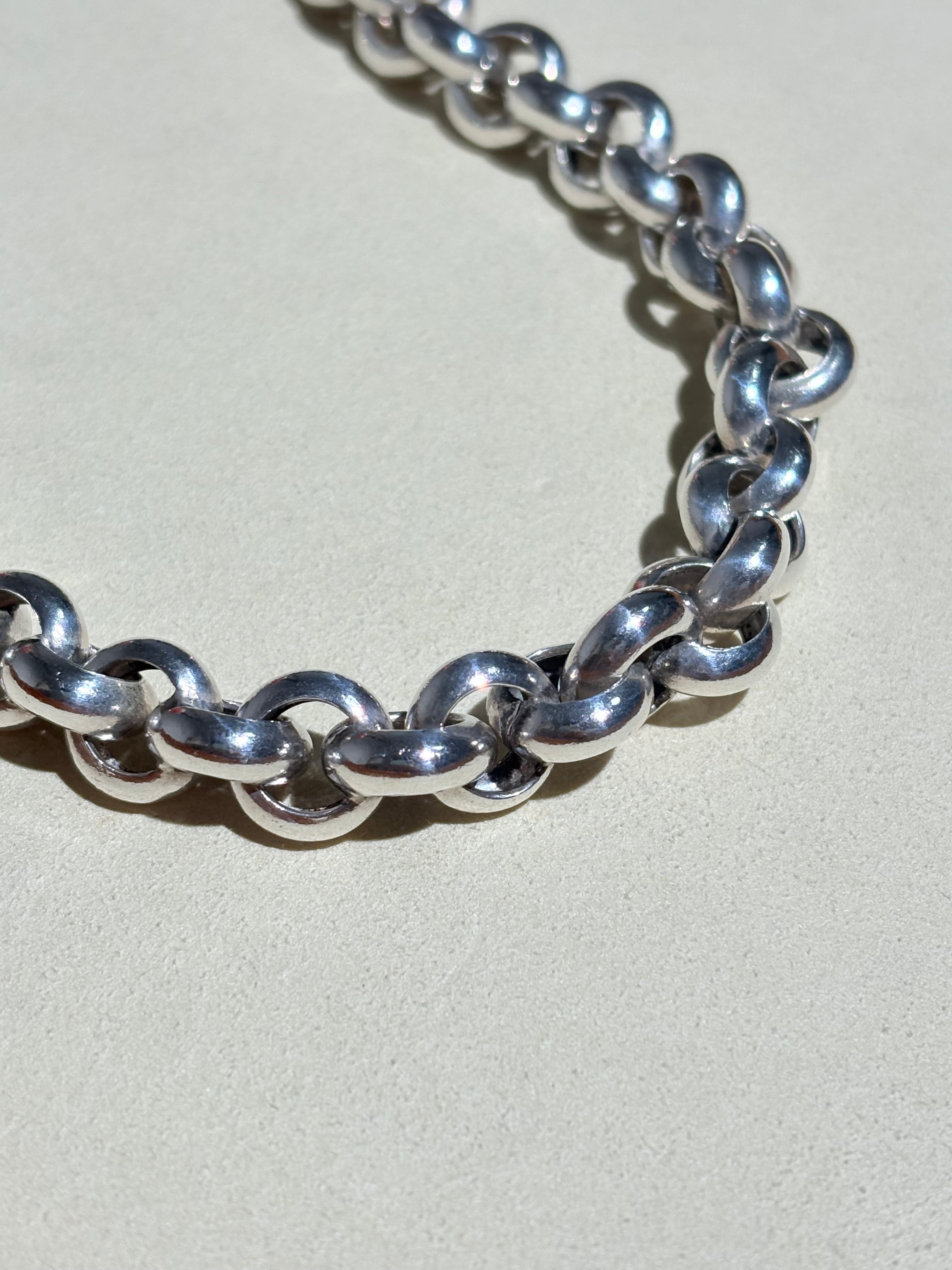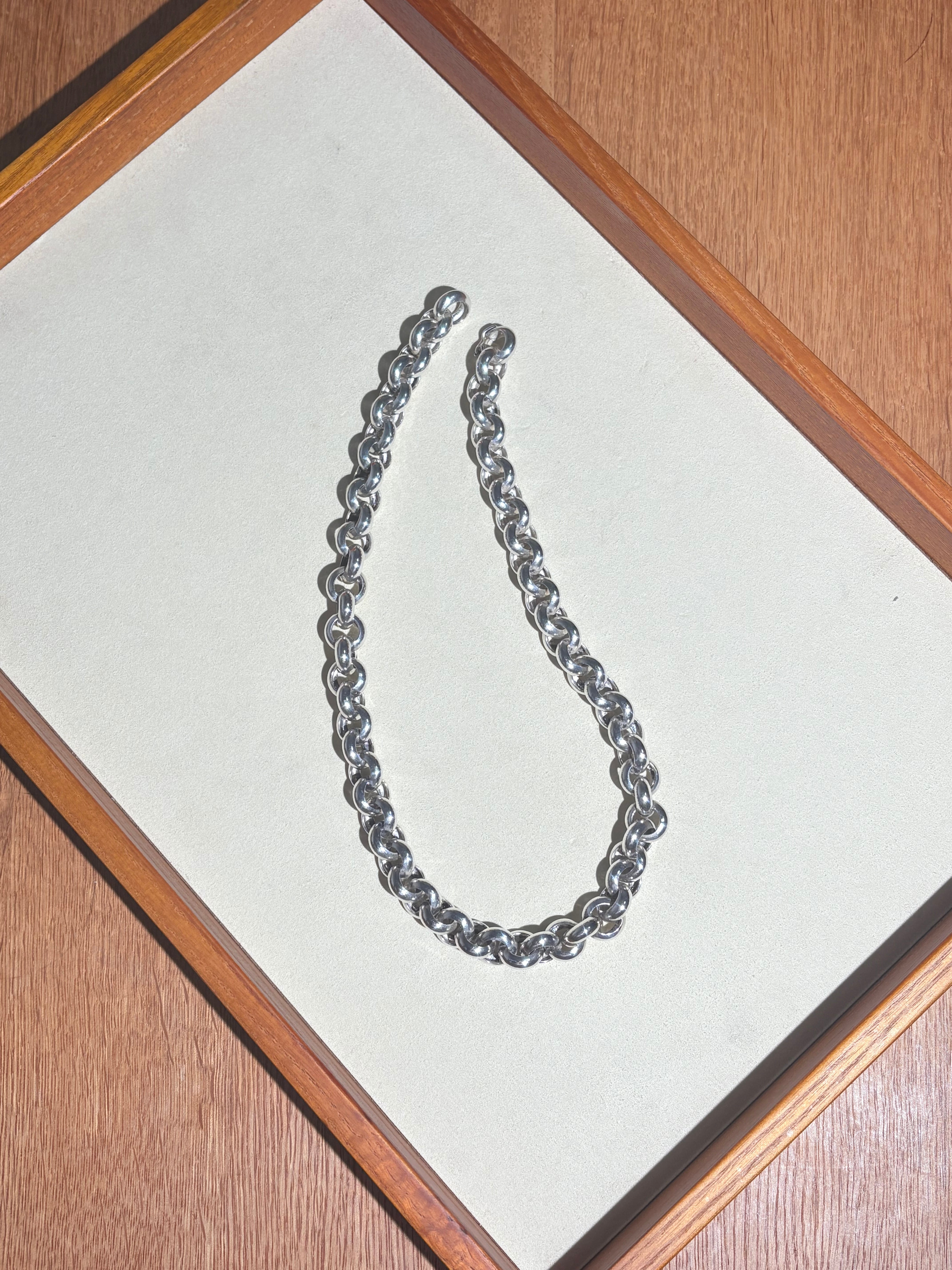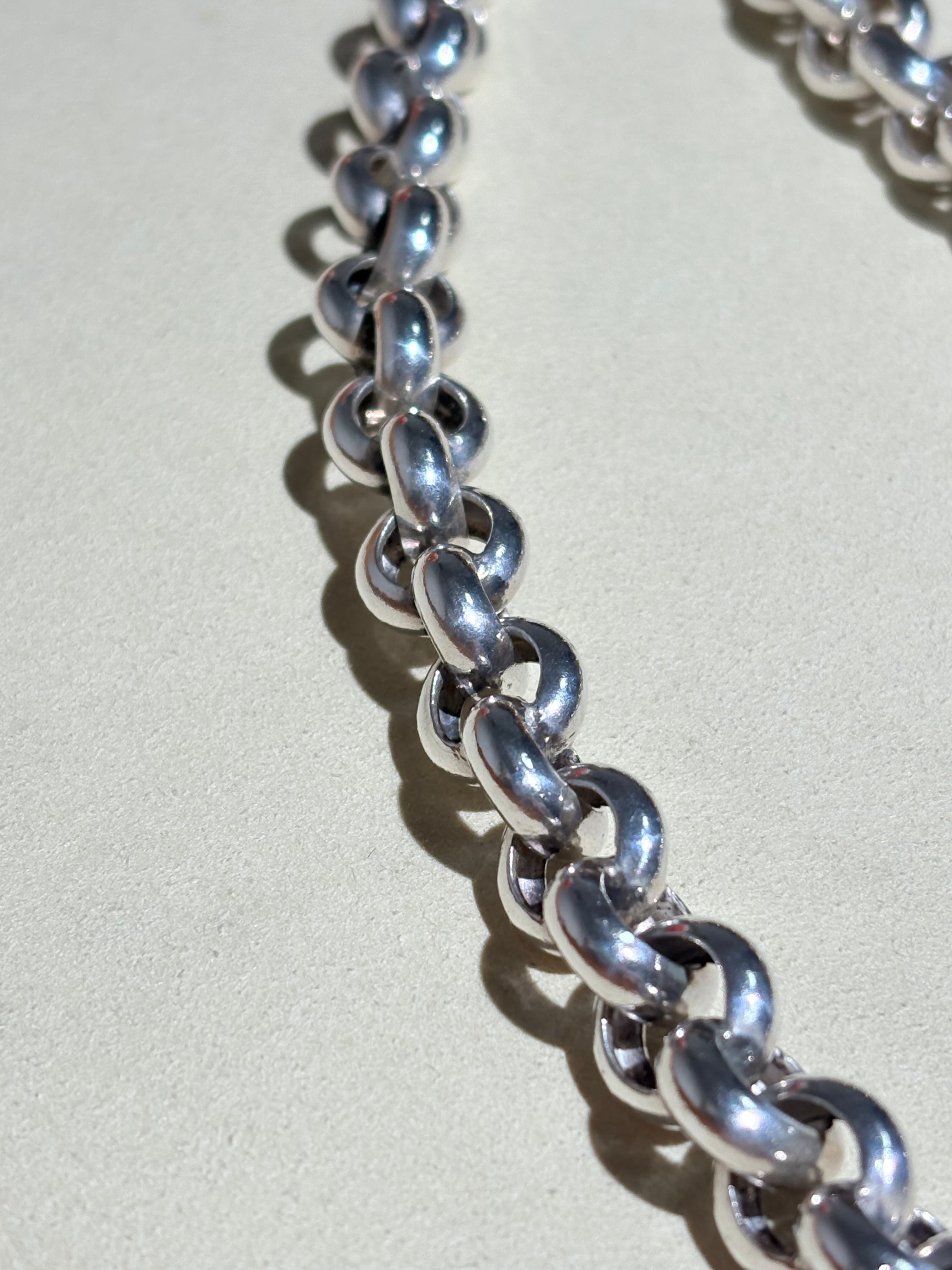 2つで一つのコマを形成する珍しい一本。留め具も隠れる美しい仕様です。丁寧な正円系のリンクを繋ぎ合わせおり、コマの形もブレにくいため、どこから見ても綺麗に映るのが良いなと感じます。