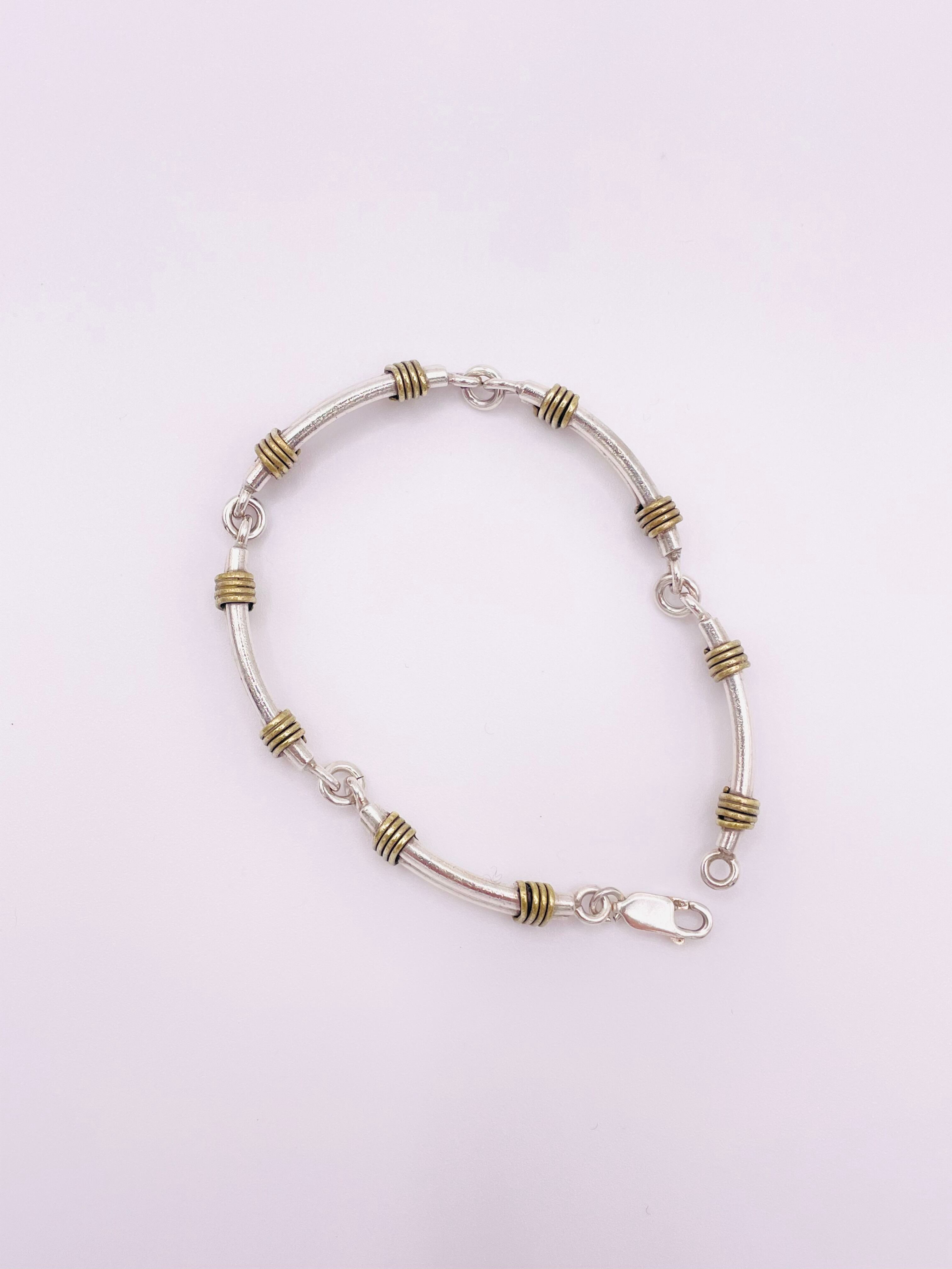 ゴールドの真鍮アクセントが力強さとエレガントさを演出しています。シルバーも真鍮も経年変化を楽しめる素材なので、年代物の良さを最大限に味わえるブレスレットですね。